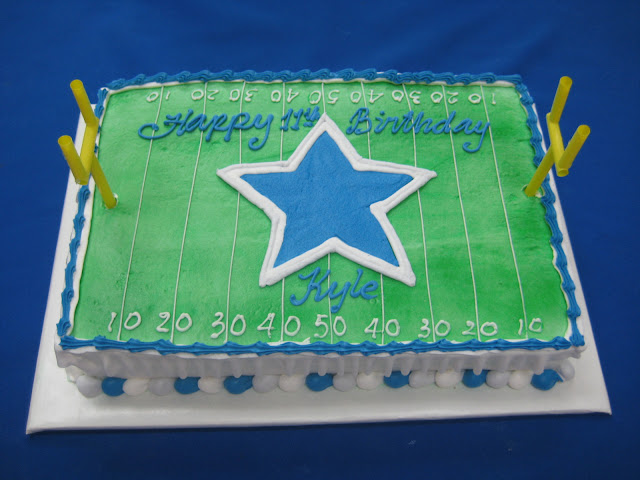 I also got to do a cake like this, only the bottom border was white scallop with blue and grey stars in between each one and the star on the field wasn't smooth. It was done with the #5 star tip, just like the other cake's number was.